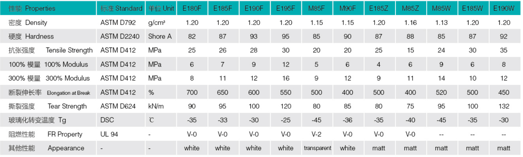 性能特性(xìng):聚醚/聚酯、無鹵阻燃、霧麵效(xiào)果、優異的耐水解性能、低溫柔韌性、耐磨性、低煙(yān)無毒(dú)、優異的耐熱、耐熱油老化性能